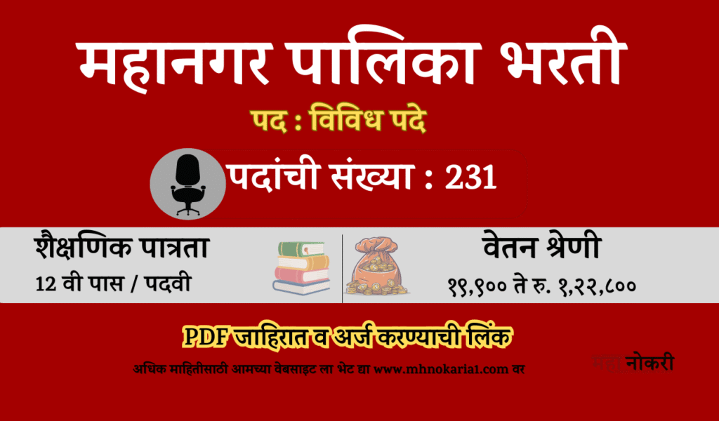 - नोकरीचा प्रकार : शासकीय/महानगरपालिका सेवा (सरळसेवा भरती).