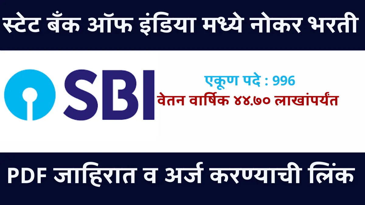 SBI Bharti 2025 : स्टेट बँक ऑफ इंडिया या बँक मध्ये विविध पदांची भरती करण्यासाठी बँक मार्फत अधिकृत जाहिरात प्रकाशित करण्यात आली असून या भरती भरती मधून एकूण 996 पदांची भरती करण्यात येत आहे तरी इच्छुक आणि पात्र उमेदवारांकडून अर्ज मागवण्याची प्रकिया चालू झाली असून खाली PDF जाहिरात व अर्ज करण्याची लिंक दिली आहे.